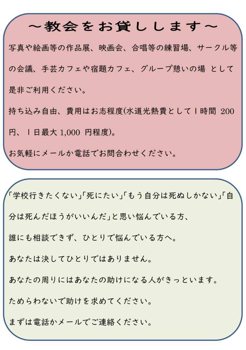 いずれの集会も、どなたにも開かれています。お気軽にお越しください。心から歓迎いたします。